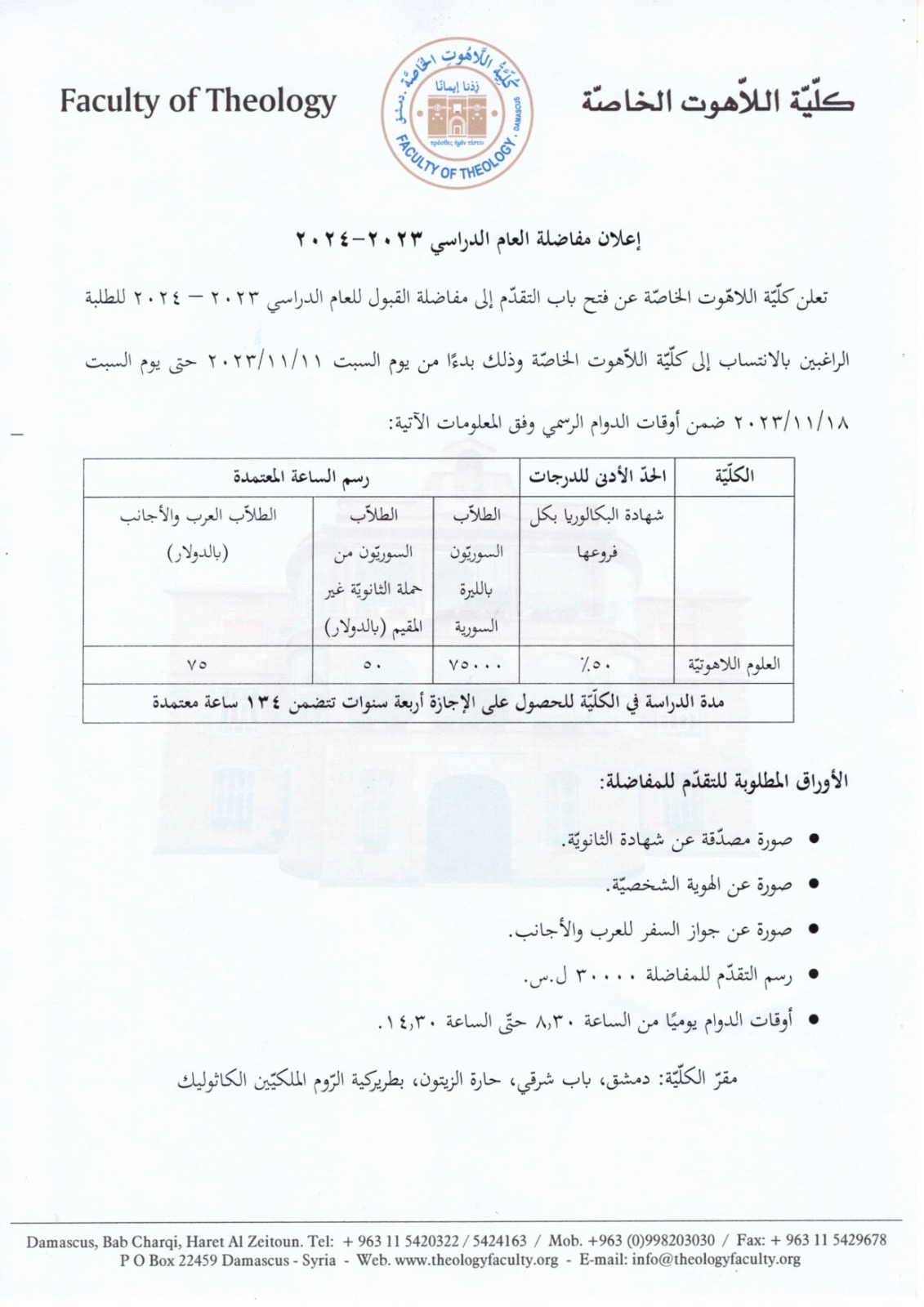 الخميس, 15 حزيران, 2023 - التوقيت 8:1 كلّيّة اللاهوت الخاصّة تستقبل وفدًا سياحيًا من إسبانيا. المزيد ![]() الخميس, 15 حزيران, 2023 - التوقيت 7:32 كلّيّة اللاهوت الخاصة ترحب بطلاب مركز التنشئة المسيحيّة. المزيد ![]() السبت, 25 آذار, 2023 - التوقيت 7:5 كليّة اللاهوت الخاصّة تحتفل بعيد المعلم وعيد الأمّ وعيد القدّيس يوسف وعيد البشارة. المزيد السبت, 18 شباط, 2023 - التوقيت 12:20 تعلن كلّيّة اللاهّوت الخاصّة عن فتح باب التسجيل للفصل الدراسي الثاني للعام الدراسي 2022 – 2023 المزيد ![]() الخميس, 10 تشرين الثاني, 2022 - التوقيت 8:1 كلّيّة اللاهّوت الخاصّة تدعوكم لحفل مرور سنة على افتتاح الكّلية وبدء العام الدراسي 2022/2023 المزيد ![]() |